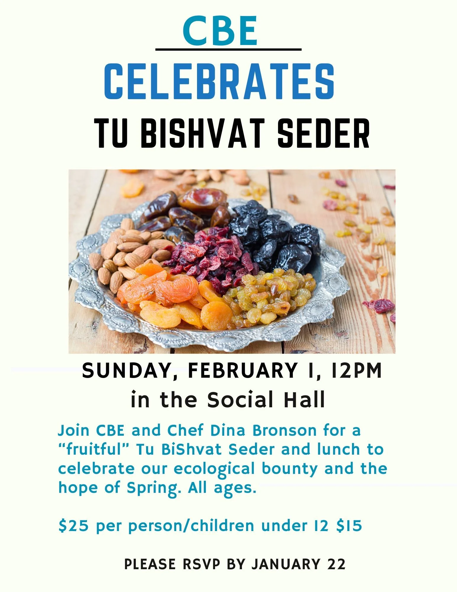 It may still be winter in Vermont, but it's the New Year of the Trees! Join CBE and chef Dina Bronson for a "fruitful" Tu BiShvat Seder and lunch to celebrate and explore our ecological bounty, our sustainable future, and our spiritual growth.