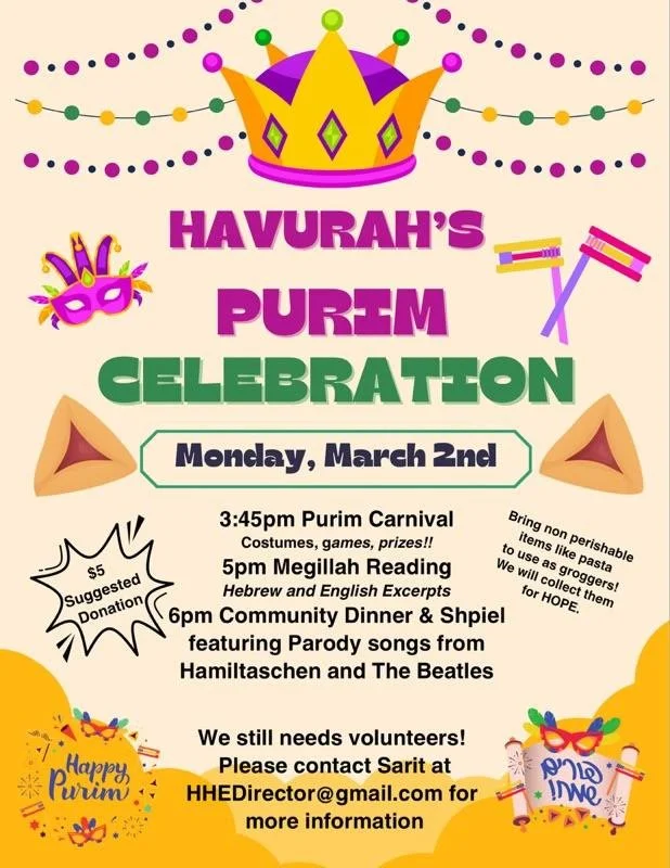We need LOTS of help and participation to make this event a success so please be in touch with Sarit if you are available to assist with any aspect: set up, clean up, baking hamantaschen, reading megillah excerpts (Hebrew of English), parody song etc.