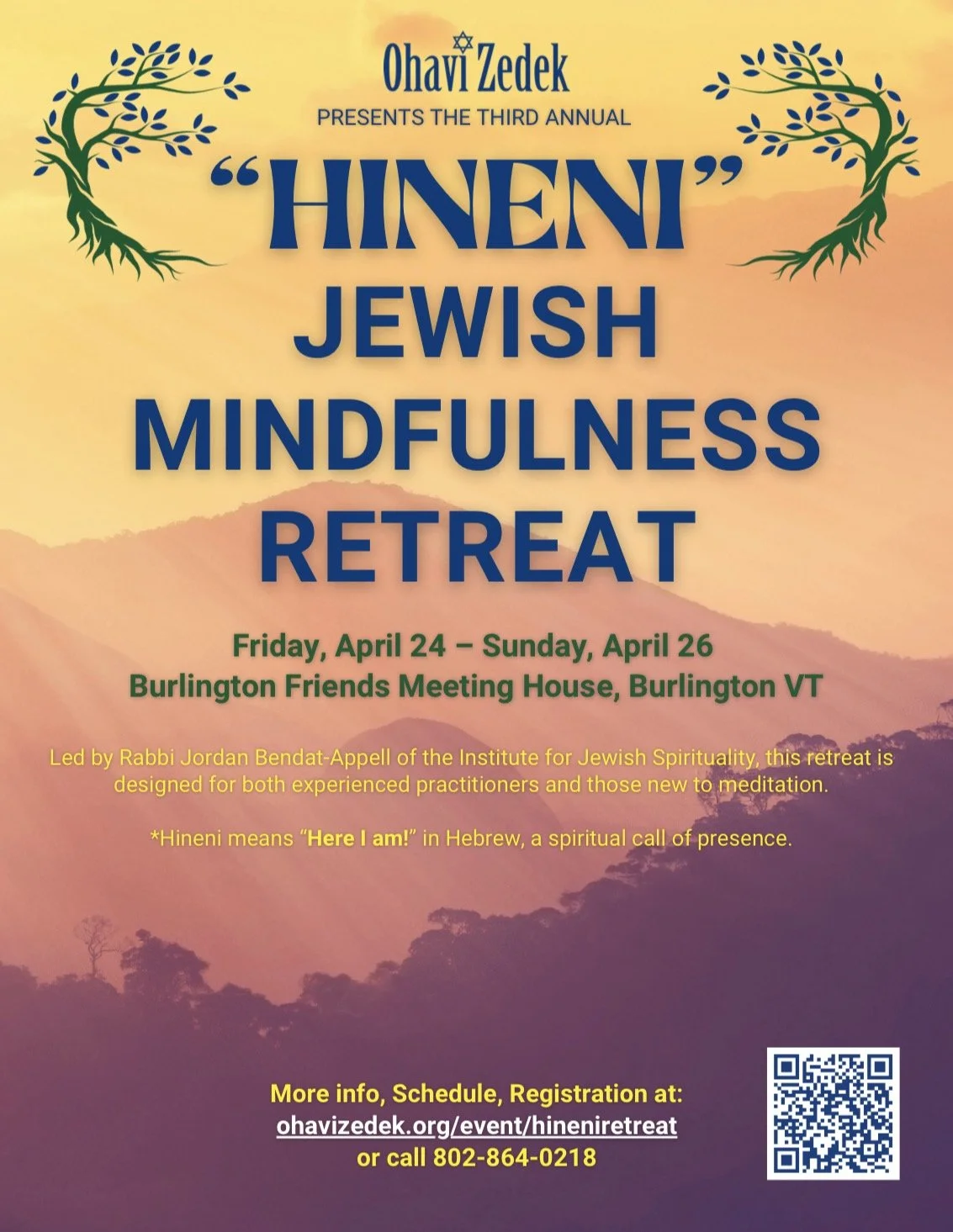 The third annual Hineni retreat* is a multi-day immersion into mindfulness meditation for Jewish, Jewish-adjacent, and curious individuals of all backgrounds. Led by Rabbi Jordan Bendat-Appell of the Institute for Jewish Spirituality, this retreat is designed for both experienced practitioners and those new to meditation.