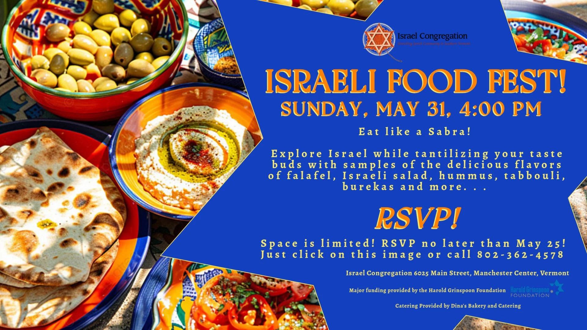 Israeli Food Fest Sunday, May 31, 2026 4:00 PM 7:00 PM Israel Congregation Manchester 6025 Main Street Manchester, VT, 05255 United States (map) Google Calendar ICS Registration
