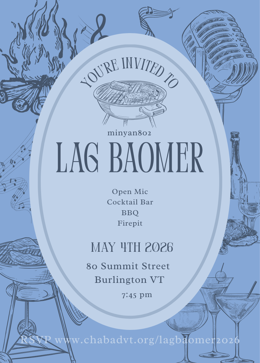 Lag BaOmer Celebration Monday, May 4, 2026 7:30 PM 9:00 PM Chabad of Burlington 80 Summit St Burlington, VT, 05401 United States (map) Google Calendar ICS