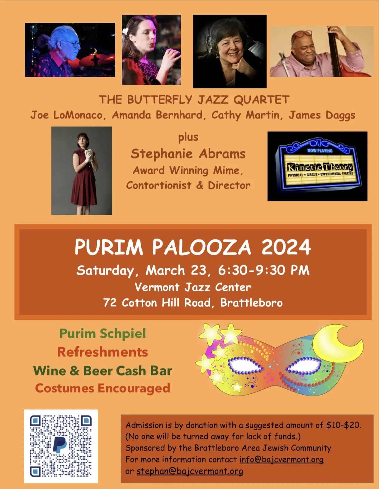 Purim Palooza Saturday, March 23, 2024 6:30 PM 9:30 PM Vermont Jazz Center sponsored by BAJC 72 Cotton Hill Road Brattleboro, VT (map) Google Calendar ICS BUTTERFLY JAZZ QUARTET Joe LoMonaco, Amanda Bernhard, Cathy Martin, James Daggs plusStephanie AbramsAward Winning Mime,Contortionist and Director