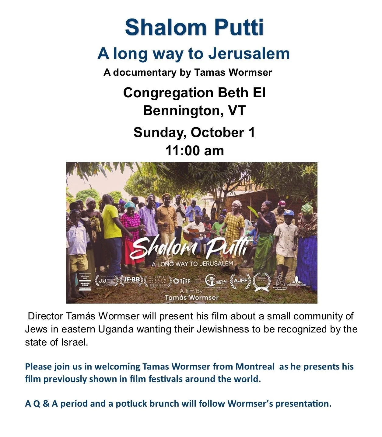 Back to All Events Shalom Putti- A Long Way to Jerusalem Sunday, October 1, 2023 11:00 AM 2:00 PM Beth El Bennington, Vermont (map) Google Calendar ICS