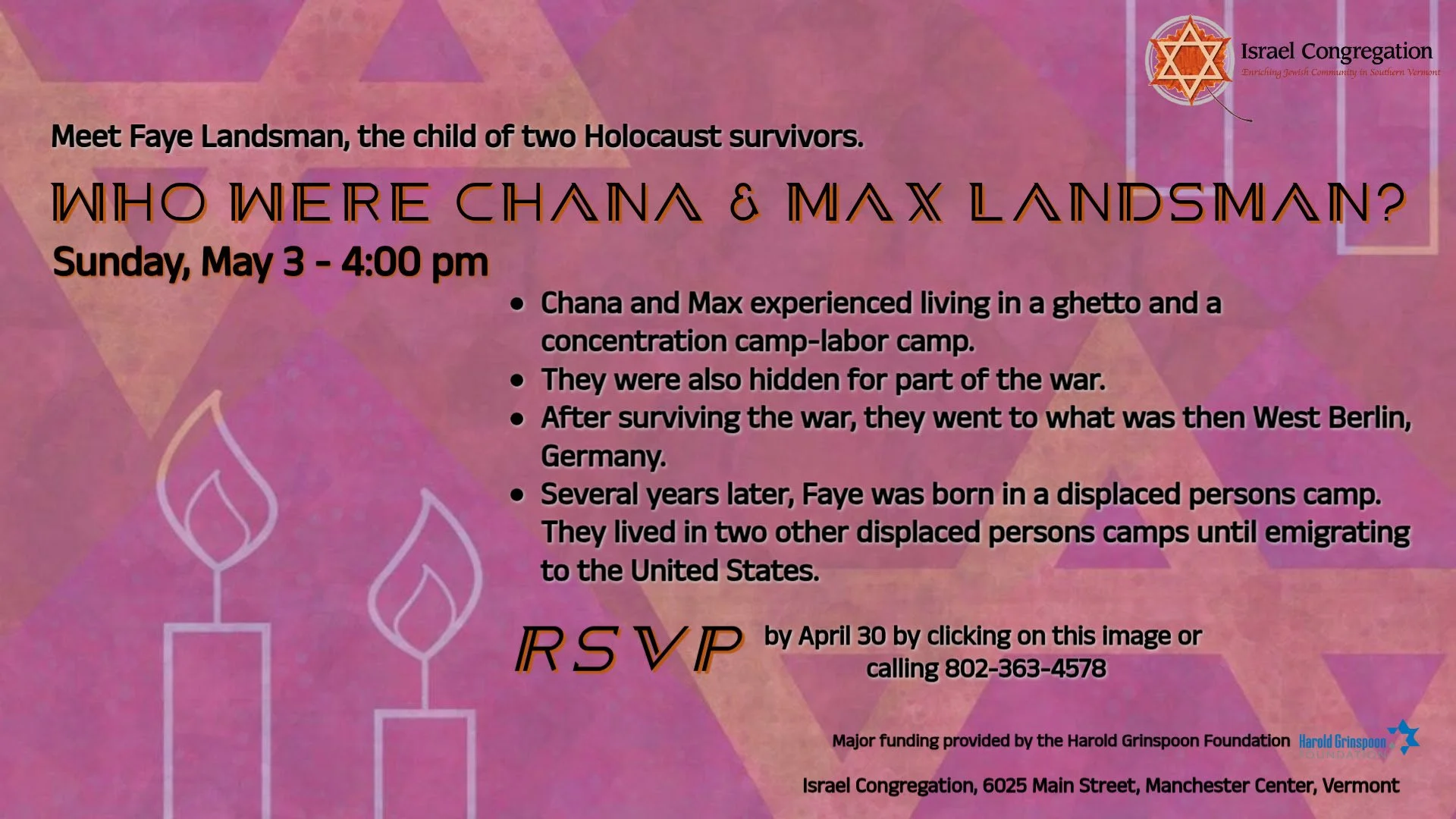 Shoah Speaker Event Sunday, May 3, 2026 4:00 PM 6:00 PM Israel Congregation Manchester 6025 Main Street Manchester, VT, 05255 United States (map) Google Calendar ICS