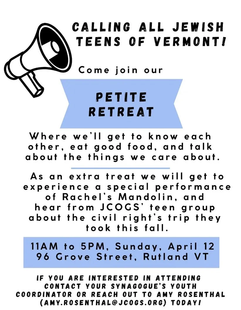Teen Petit Retreat Sunday, April 12, 2026 5:00 PM 6:00 PM RJC 96 Grove Street Rutland, VT, 05701 United States (map) Google Calendar ICS