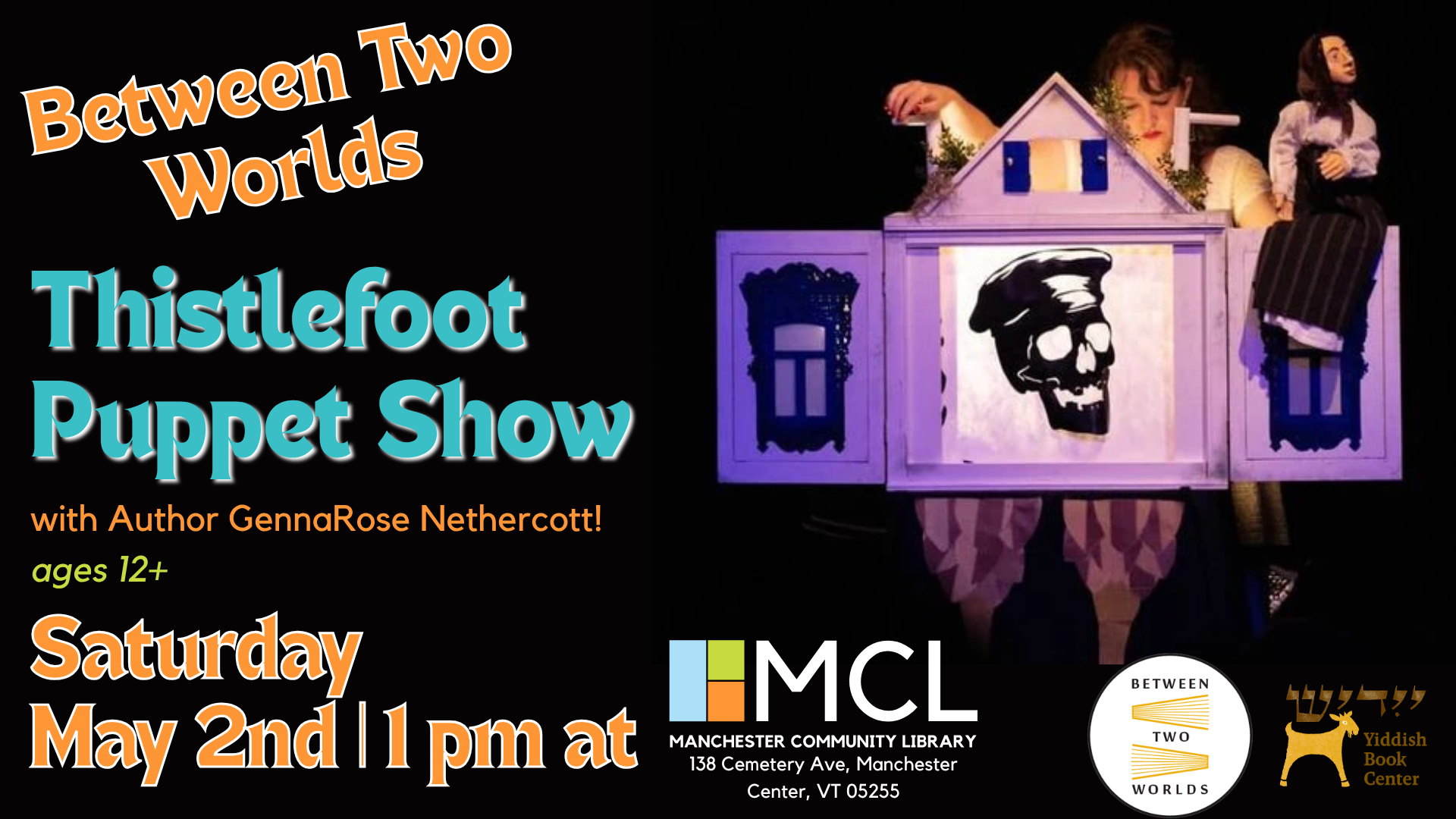Thistlefoot Puppet Show Saturday, May 2, 2026 1:00 PM 3:00 PM Manchester Community Library 138 Cemetery Avenue Manchester, VT, 05255 United States (map) Google Calendar ICS