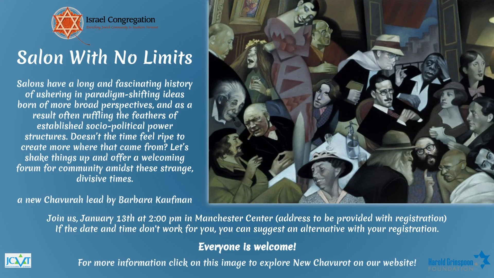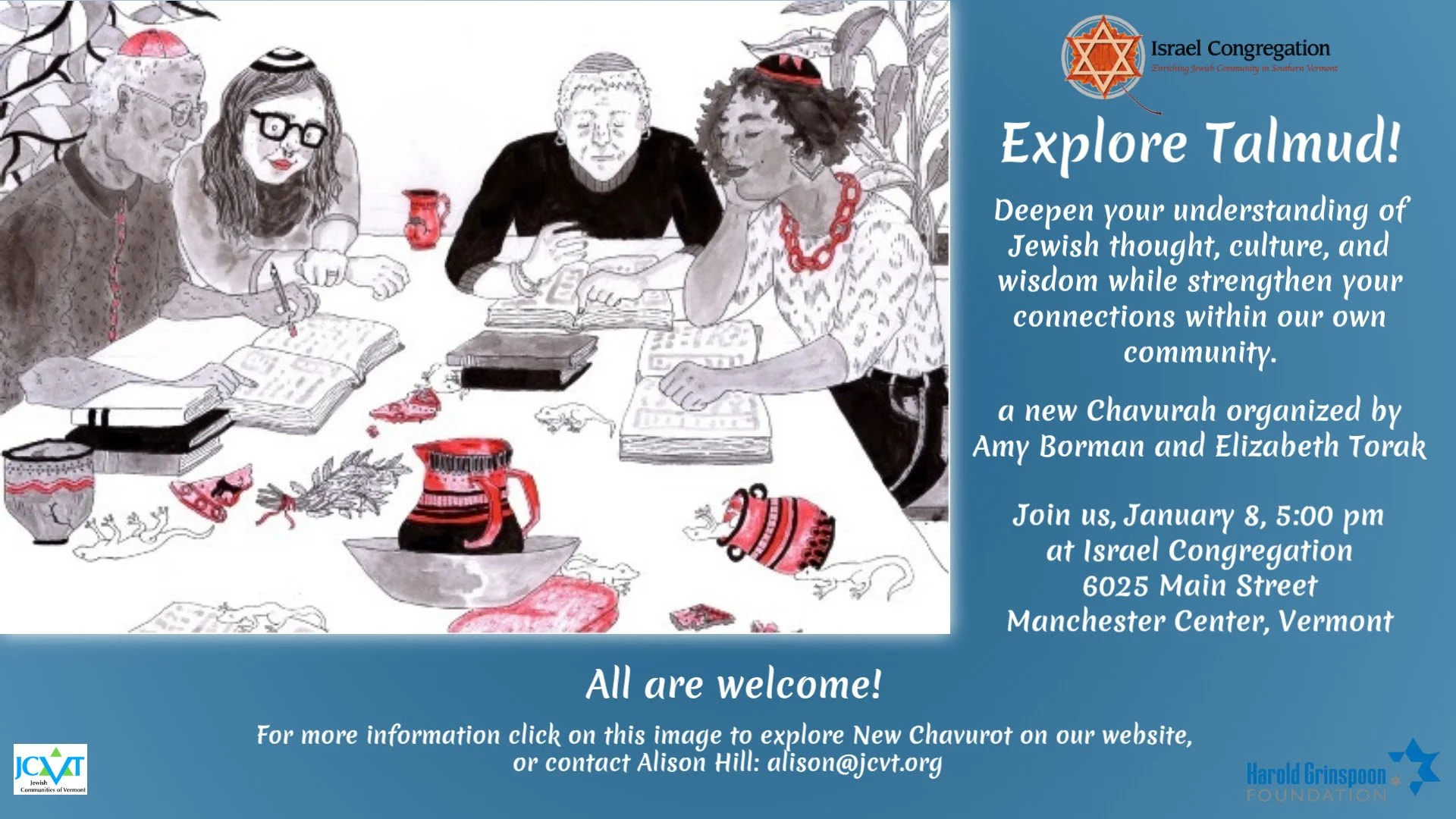 “Havurah: An Experiment in Jewish Gathering” is an initiative through the Jewish Communities of Vermont (JCVT) and funded by the Harold Grinspoon Foundation. This exciting grant opportunity provides financial and mentoring support to individuals to initiate small affinity groups (Havurot). These Havurot aim to create an intimate community where deep, caring supportive relationships are fostered between the members of the group as they share and explore a focus of their own choosing. The group sets its own agenda, is peer-led and meets on an ongoing basis. A Havurah should ultimately have a minimum of seven people, meet nine times a year or more, have Jewish content, have shared leadership and be affiliated with a Vermont Jewish organization. The grant provides funding for group expenses as well as to the “connector” of the group who is responsible for coordinating the logistics of the group and is responsible for reporting to and meeting with the grant coordinator. JCVT would like to support you in developing these homegrown, peer-led, Jewish gatherings.