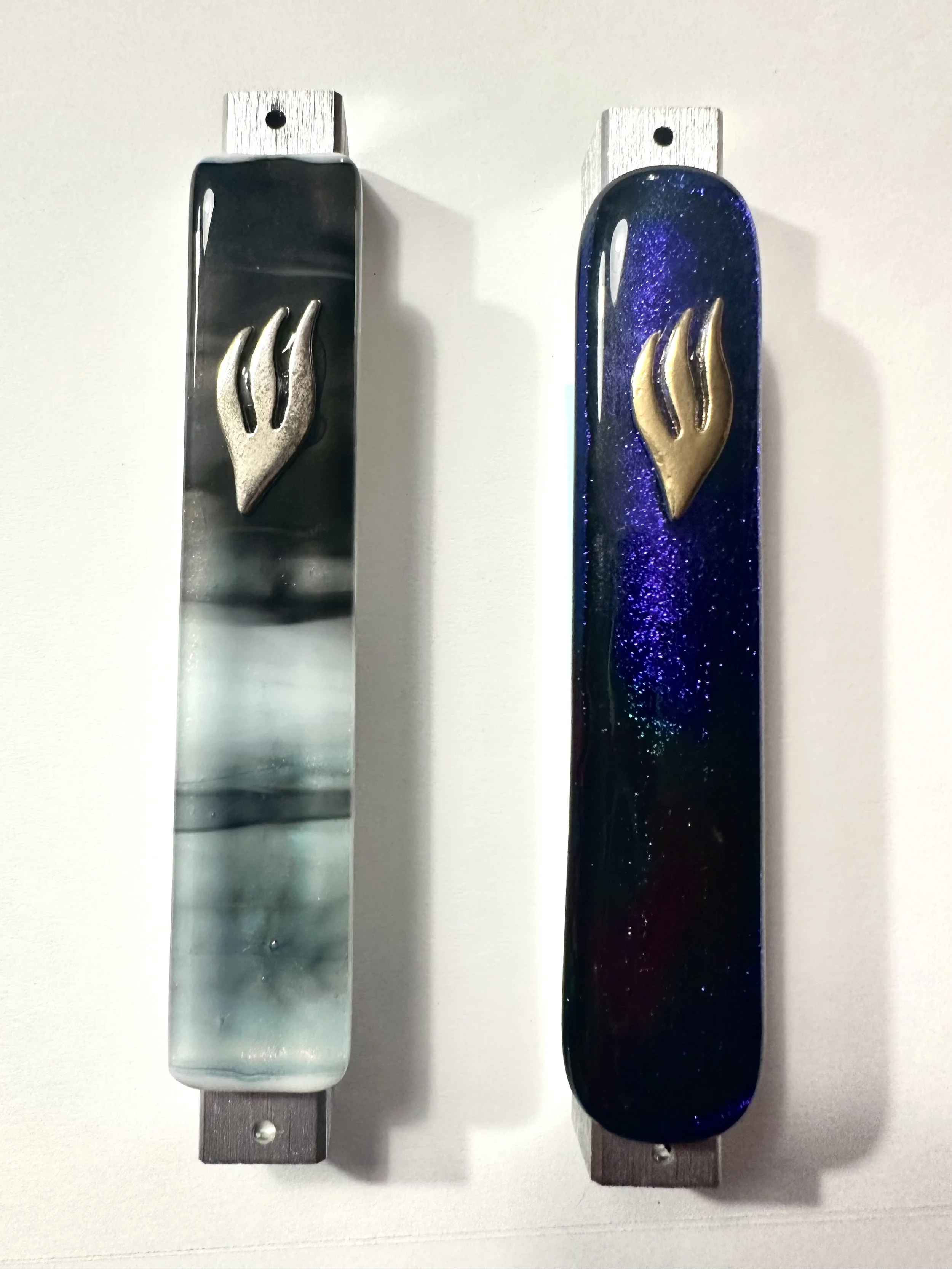 Fused glass menorahs and mezuzotHerculean Woodworks